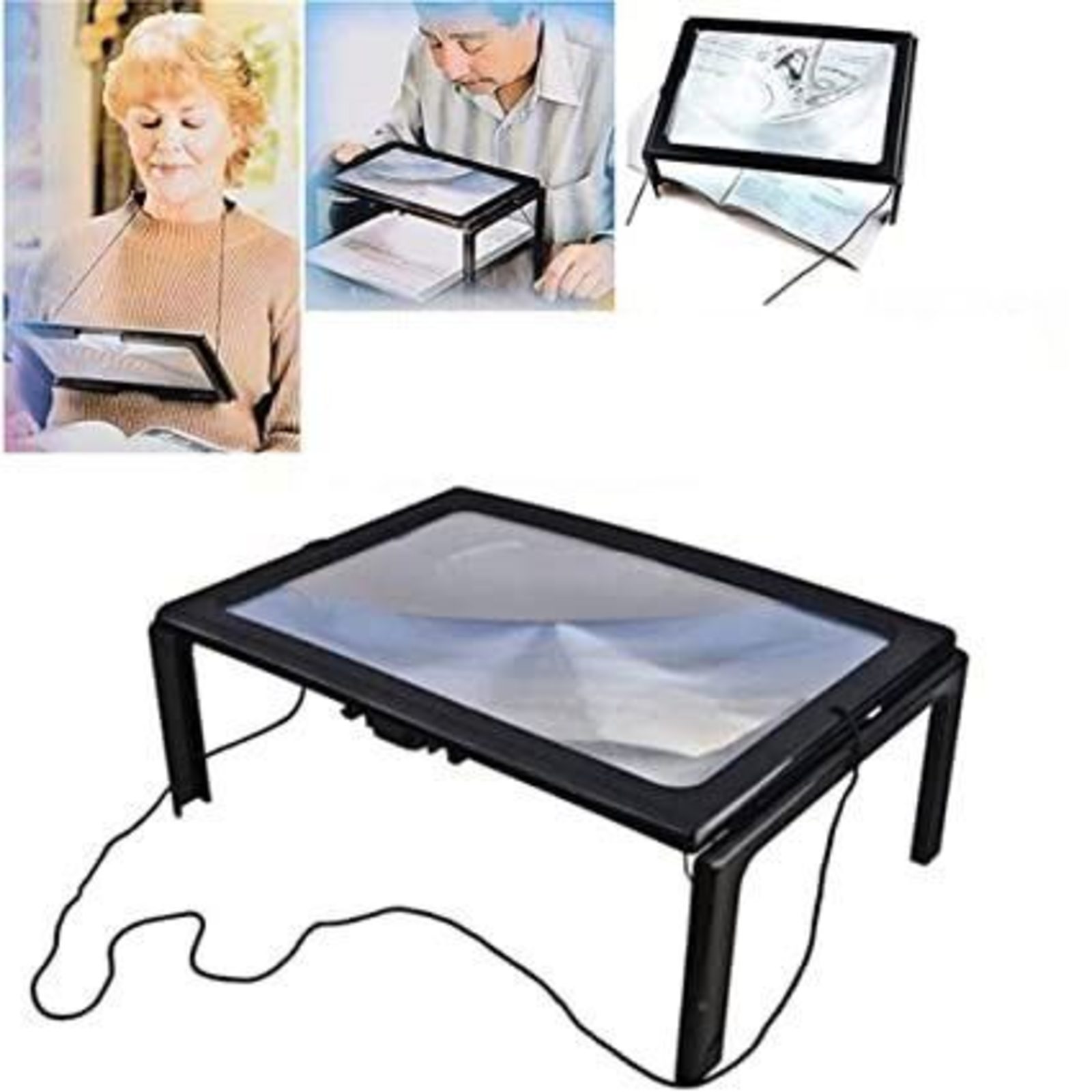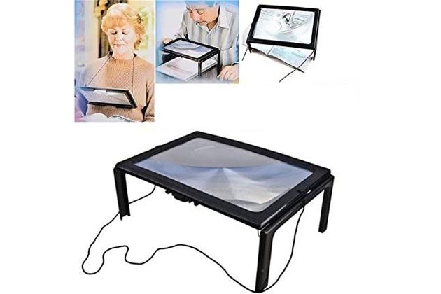 Čtecí-pracovní lupa s osvětlením k postavení na podložku nebo zavěšení na krk. Složenou je možno používat i jako ruční lupu. Usnadní čtení nebo práci.