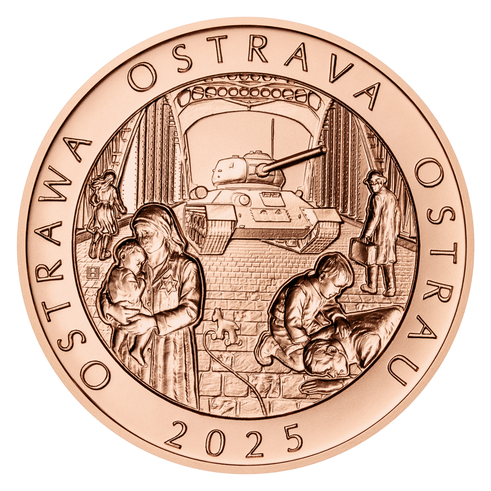 Nemálo obyvatel města během ní zmizelo, stopa po nich však v Ostravě zůstala. Na medaili jsou proto symbolicky zobrazeni negativními reliéfy – jejich postavy z kovu nevystupují, ale ztrácejí se v hloubce.
