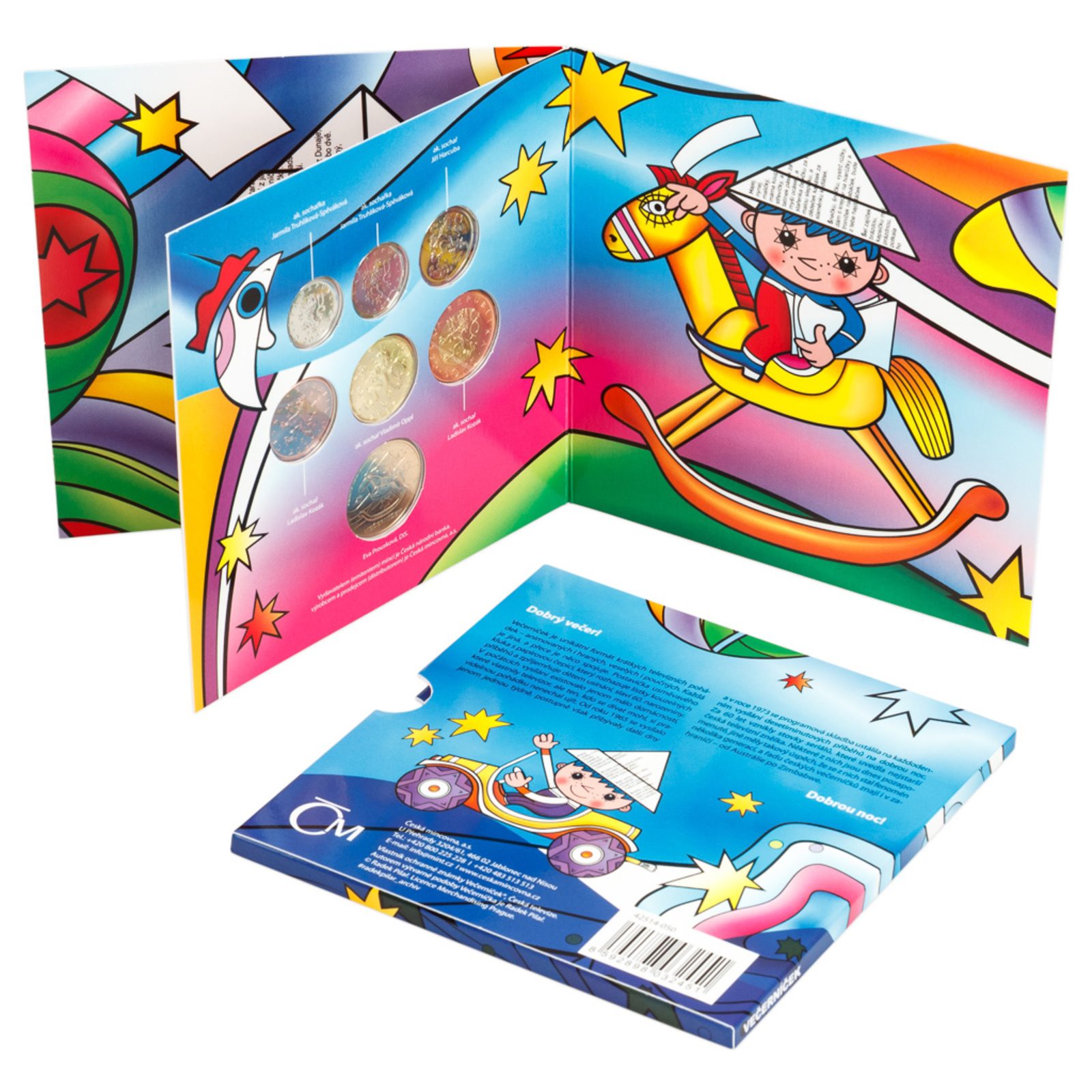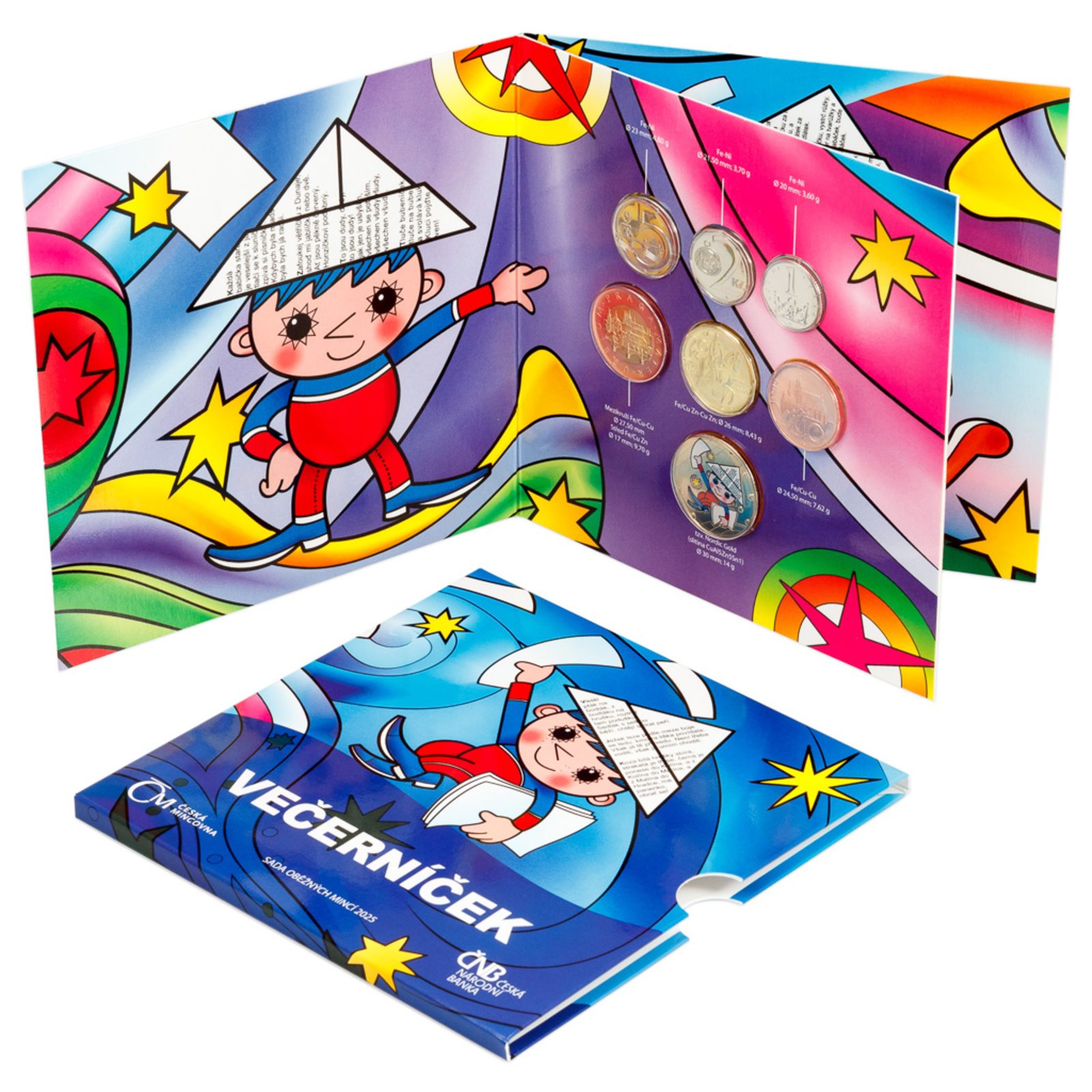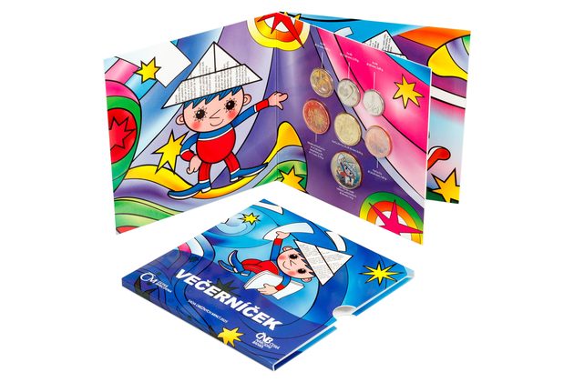 Tato speciální sada českých oběžných mincí pro rok 2025 je věnovaná postavě, která po desetiletí patří k neodmyslitelným symbolům dětského světa – Večerníčkovi. Známý kluk s papírovou čepicí přinášel každý večer pohádky generacím dětí a zapsal se hluboko do kulturní paměti. Uvnitř najdete šest standardních mincí české měny v nominálních hodnotách od 1 do 50 Kč, všechny s rokem ražby 2025. Součástí sady je navíc i speciální žeton s motivem Večerníčka. Vše je vložené do atraktivního barevného balení s ilustrací slavné postavičky.