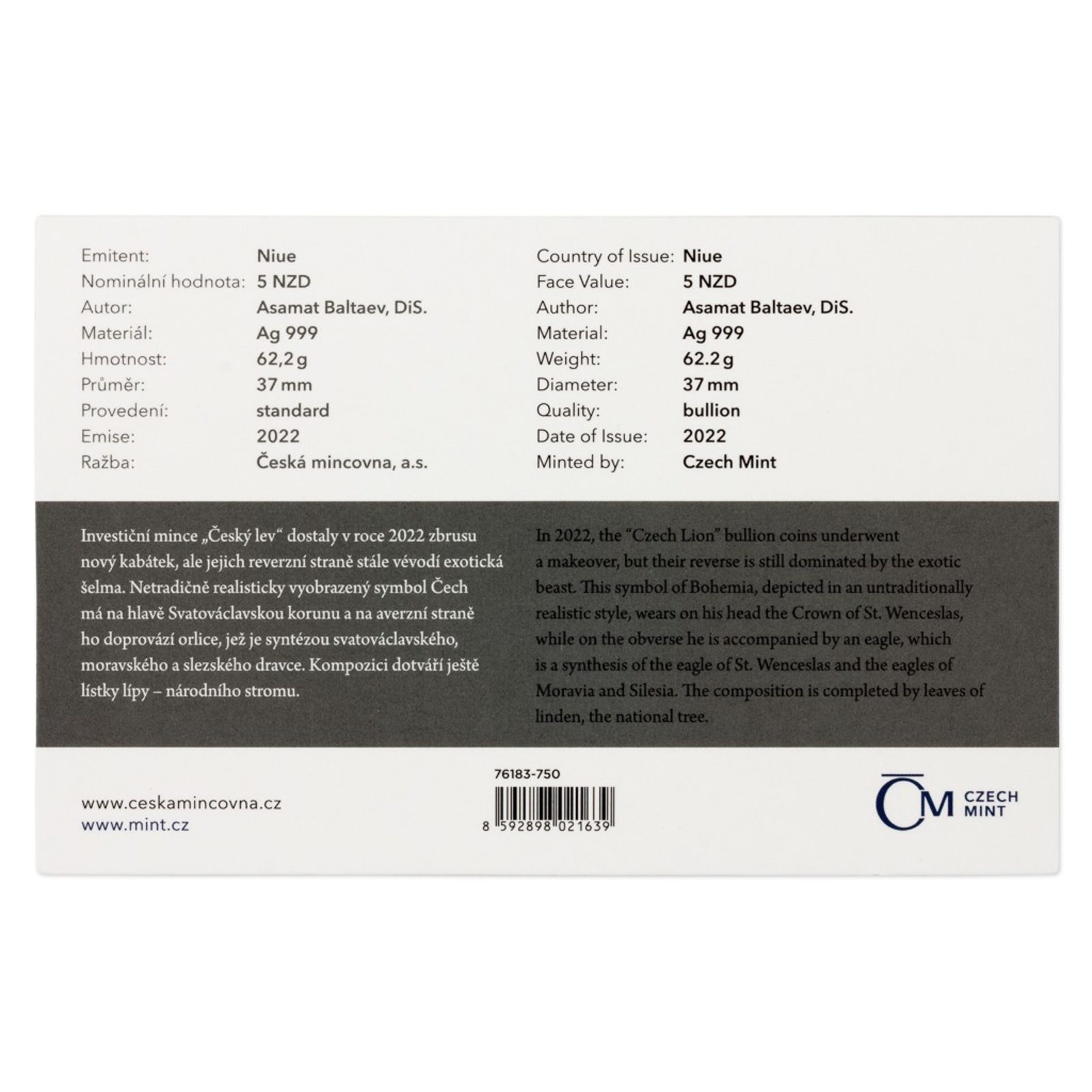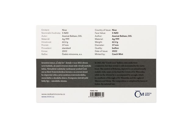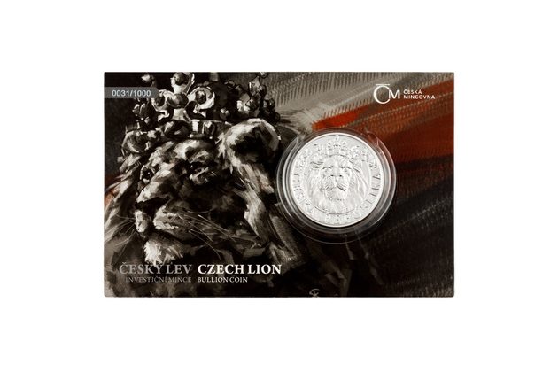 Stříbrná dvouuncová investiční mince Český lev standard číslovaná (ČM 2022)