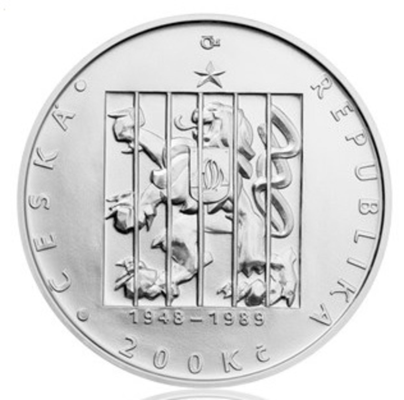 Jednu stranu mince zdobí plastika českého lva, našeho státního symbolu, vyobrazeného v otevřeném okně. Na straně druhé je ten samý pohled, ale na lva za mřížemi s letopočtem 1948-1989. Tento motiv je doplněn nápisy Česká republika, nominál mince a letopočty 1989-2014.